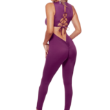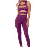 Enterizo largo en tono morado con múltiples aberturas desde el cuello hasta el abdomen, incluyendo una preciosa piedra de cristal en la zona alta del pecho como detalle.