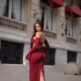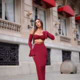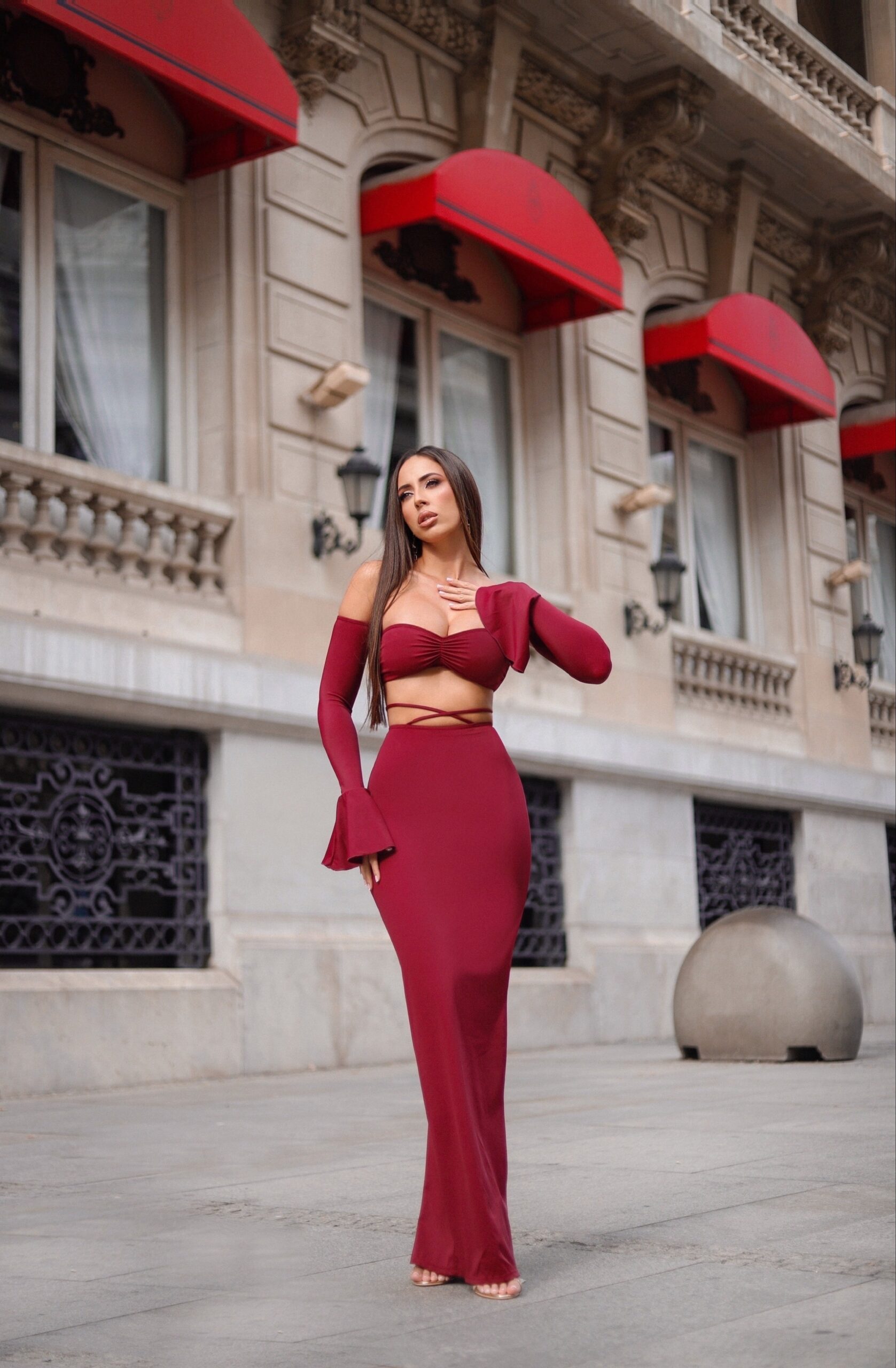 Precioso conjunto dos piezas en color burdeos compuesto de top y falda larga en corte V. Tiras ajustables y frunce en los glúteos creando efecto push up.